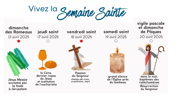 Voici les lieux et les horaires de la messe du dimanche des Rameaux du 13 Avril 2025 dans notre Ensemble Paroissial :
